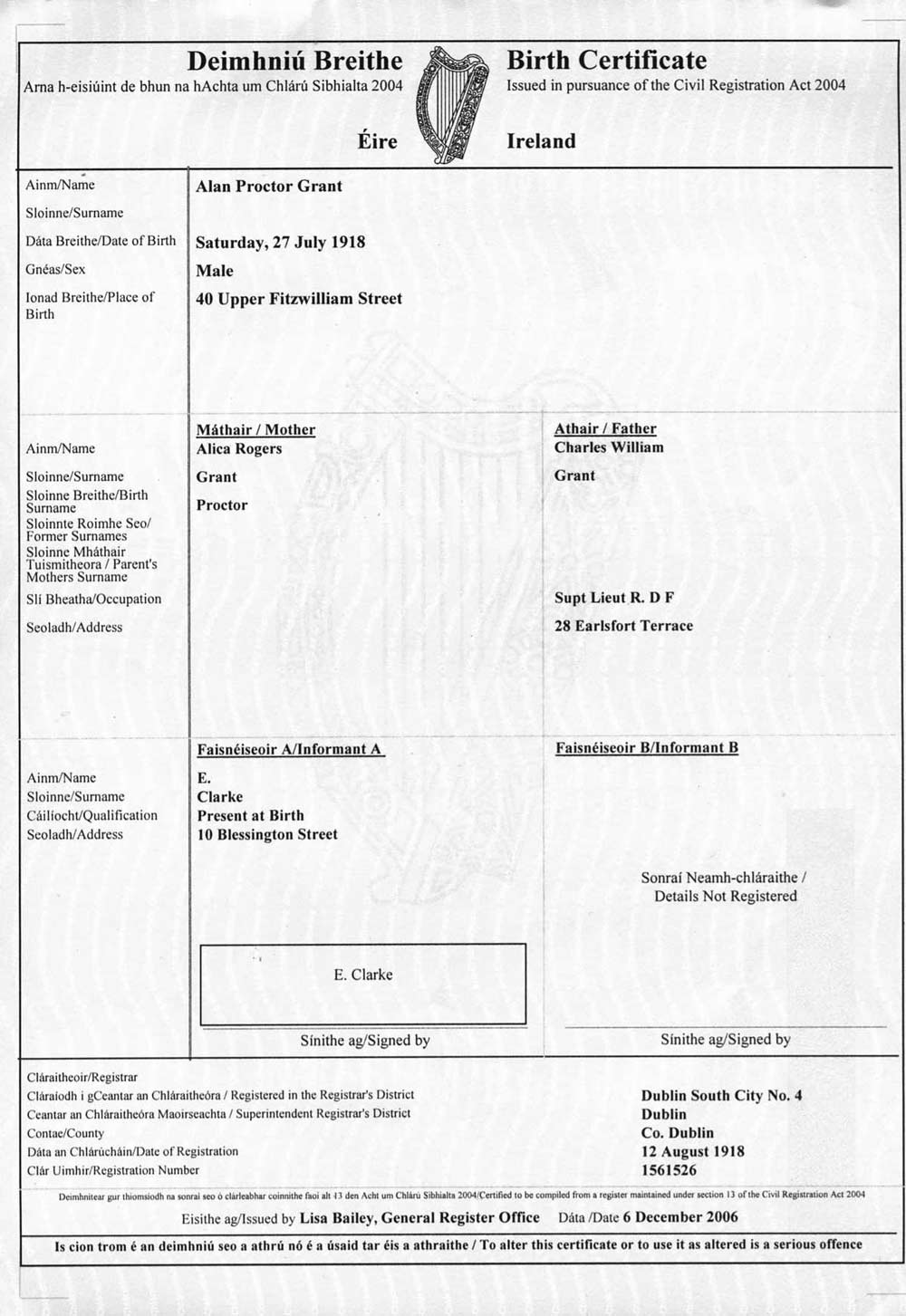 Alan Grant b1918 Birth Certificate