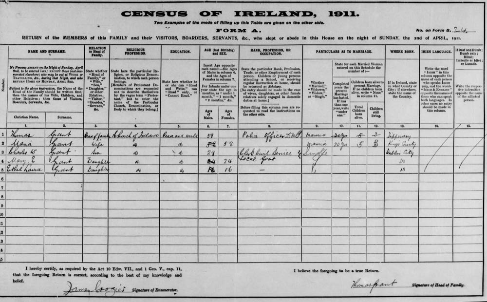 Thomas Grant and family at 24 Rathgar Rd, Dublin in 1911 census