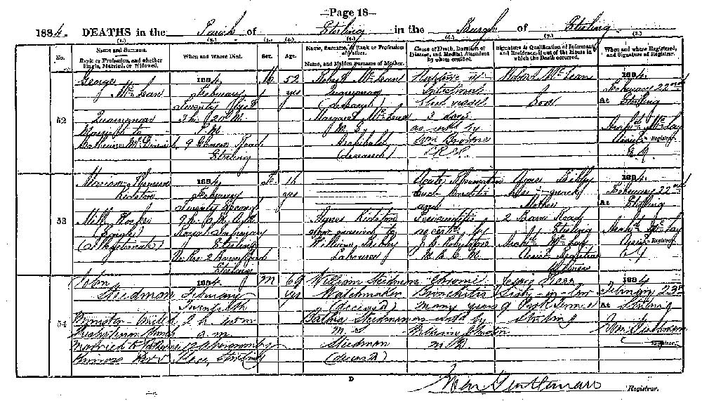 John Steedman, Minister United Presbyterian Church married to Catherine Kinross Kerr, 20th February 1884 at 2.45 am at 12 Abercromye Place, Stirling. Age 69.
