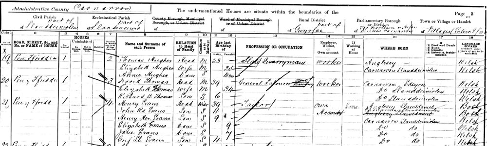 The family lived for a time at 3 Bakehouse Street, Rhiwlas. This property was empty at time of 1901 census. She also lived at High Street in Rhiwlas. 1901 census shows her living with her widowed father at Pen-y-Ffridd on the outskirts of Rhiwlas. I thought that this might have been where Henry Evan's mother-in-law, Elizabeth Hughes, had been living, but researching the census enumerators route for both places leads me to conclude that they are different places as shown on the map below.