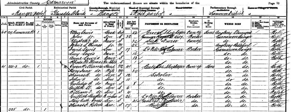 1901 census return for 221 Carnarvon Road, Bangor showing a butcher called Williams living there