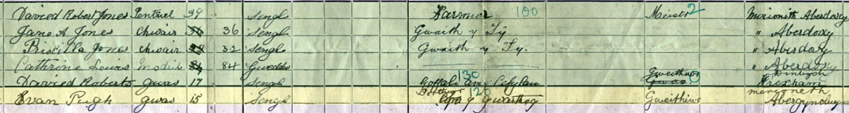 1911 census at working as a servant at Trefeddian Terrace, Aberdovey (gwas is servant and gwartheg is cattle)
