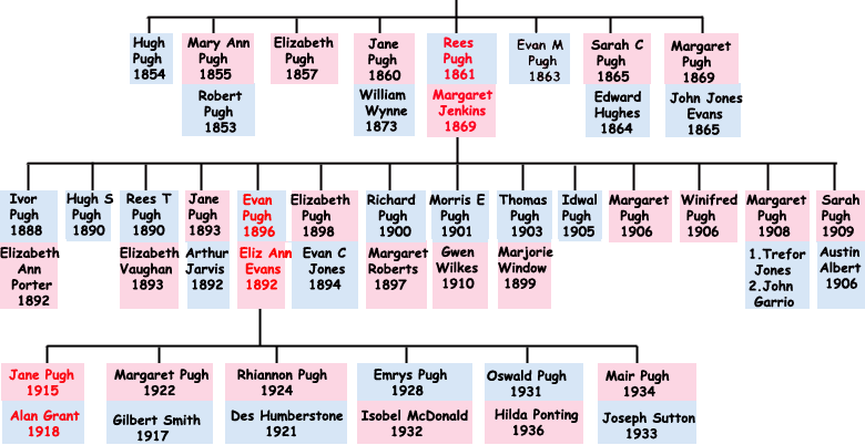 I understand that Evan Pugh was annoyed when his brother Hugh Pugh returned to the UK as he did from time to time and did not want the family to have anything to do with him. I am not sure why this was. Hugh died in San Francisco in 1968, and his death certificate gives him as "widowed", but we have no knowledge of any family of his in the USA. Hugh married in the USA in 1929, but did not have any children