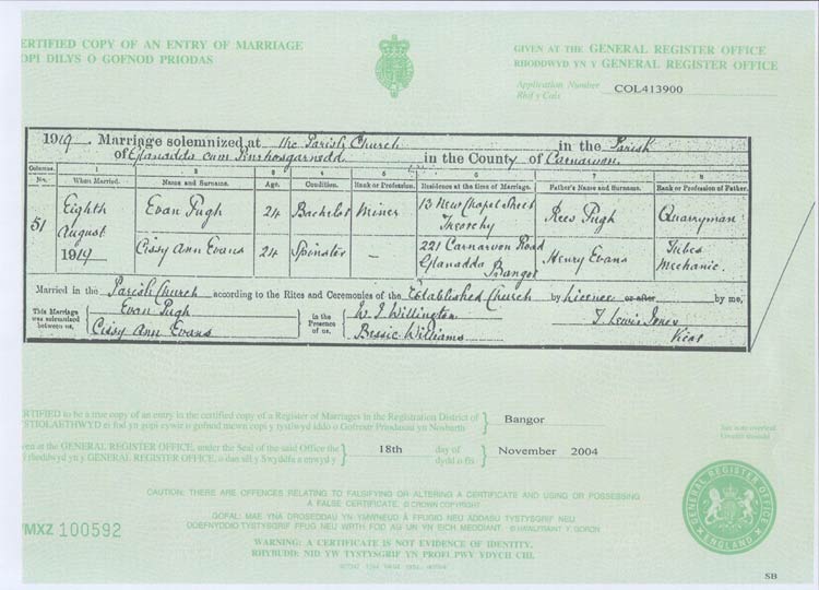 Marriage on 8th August 1919 at the Parish Church of Glanadda with Penrhosgarnedd between