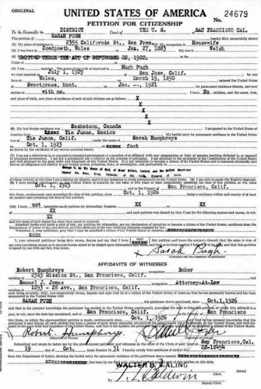 1955 Mar 18. California Death Record. Sally Pugh, Birth date 01/27/1883, Birth place Other Country . Death date 03/18/1955 , San Francisco. Father's last name Humphrey. Mother's last name Griffith