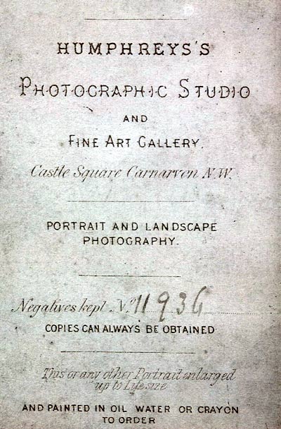 HUMPHREYS Fine Art Gallery, 13 Castle Sq, Carnarvon appears in trade directories for 1880, 1883, they then appear as just HUMPHREYS Hugh 14 Castle Square, Carnarvon in trade directories 1889, 1895 1889, 1895. Note subtle change in name, plus change in address. Given the period that the Hugh Humphrey Studio operated it would be consistent with dating this photo to a later period of their existence (negative number 11936), so my estimate of a girl aged 21 taken in 1886 would be possible - take 10 photographs a day, 200 days a year, for 5.5 years to get to 11,000.