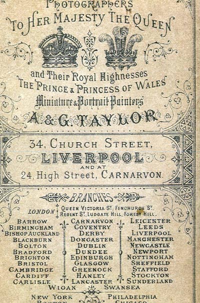 TAYLOR A& G operating from 24 High St, Carnarvon appear in trade directories of 1880, 1883, 1889, 1895, but not later (the next directory was published in 1907) , So this woman could have been photographed any time between 1880 and 1901 (death of Victoria). Taylors was a chain of photographers with 24 shops in Wales.
