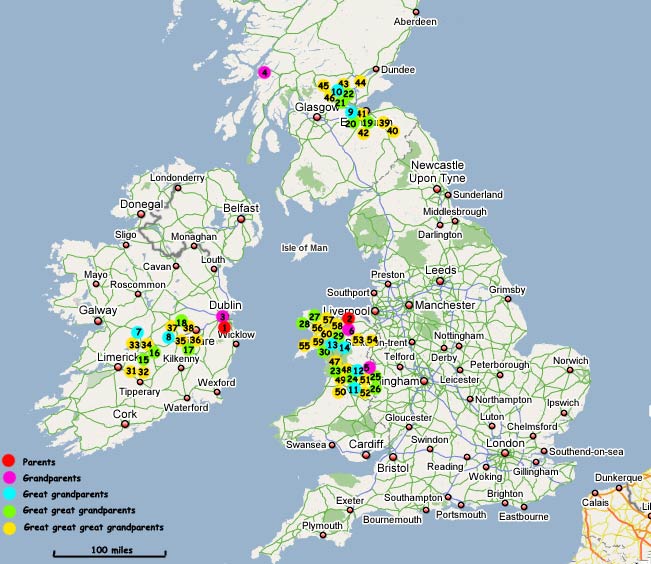 I am the end product of my 4 grandparents. It is intriguing to see that the 2 Welsh grandparents and the Scottish grandparent had come from families who had moved within small local distances (that is within circles of 15 to 18 miles) and that the Irish grandparent had come from a family that moved more, but still within a 40 mile radius.