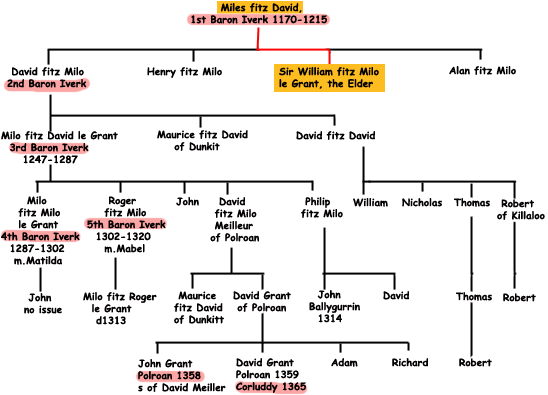 Family tree from 1st Baron Iverk 1170 to Polroan/Curlody c.1365