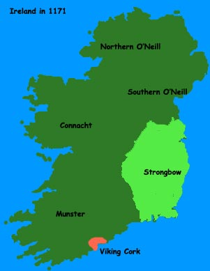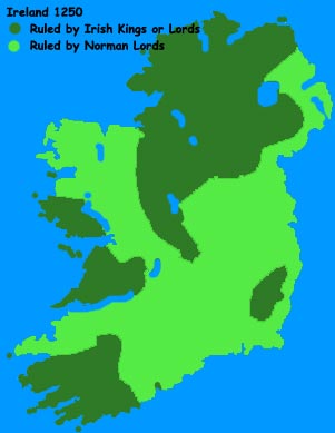 It is important to realise that even at the height of their influence (about 1300), the Normans only controlled about half of Ireland. They colonised the better lowland agricultural land in Leinster and Munster, leaving the entire north and west untouched except for the odd fort. Nor did they colonise the hilly areas of the south and east, such as the Wicklow Mountains. Irish chiefs held the rest of the country, each controlling a limited area, fighting border wars against either Norman colonists or neighbouring chiefs. So no cohesive opposition against the Normans existed, but there were continuous border skirmishes.
