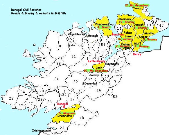 From the detailed readout of all surnames in Donegal in Griffiths that start with "gran". Putting these on the map gives the spread that is shown on the map above. There are 5 groups worth considering