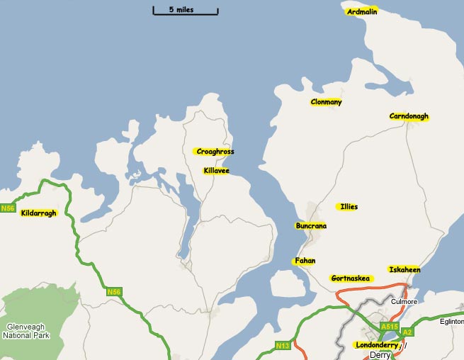 I have been trying to trace the branches of the Grants from Donegal, so far without success. It would appear that they lived around Buncrana in the 1800's, but it is unclear where they came from before that. The only historical references I have found have dated from around 1840, and I have put on the map above the locations where they were to be found between 1840 and 1900. Today there are still Grants in and around Buncrana. The Irish Phone Book in 2008 had 135 Grant entries and the main concentrations were