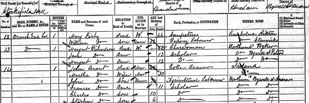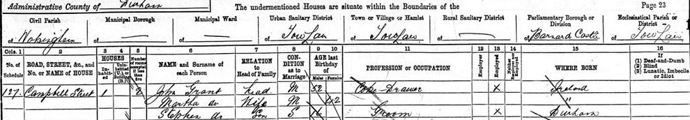 The two younger children were brought up together, possibly with their father when he remarried. He married for the second time a widow called Black, who did not get on at all well with the Grant children, she was 10 years younger than he, and born in Co Derry, Ireland. He moved to Tow Law between the 1881 and 1891 censuses, and in 1891 is living near his brothers Richard & Stephen