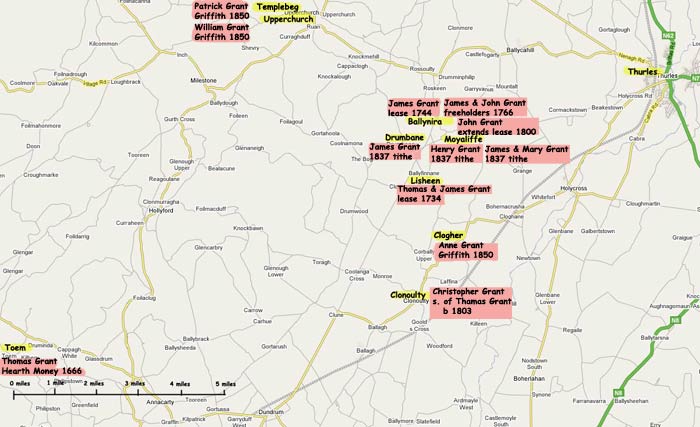 Thomas Grant is in the 1666 Hearth Money Roll for the Parish of Toem. Evidence would suggest that this is the man dispossessed at Ballynabouly, who sold his transplanted land in 1656. There is no further mention of Grants at Toem, but the family which was Protestant at the time, probably moved 12 miles to Moyaliff. In 1734 they appear at Moyaliff in a deed in which Thomas and James Grant obtained the lease on land at Lisheen. Land Registry records show that James Grant leased 56 acres at Ballynira in 1744, and in 1759 James Grant leased Stradbally for £70 rent. The 1766 list of freeholders of Co Tipperary gives James Grant and John Grant, both of Ballynira. It should be noted that there were then under 1000 freeholders in Co Tipperary. In 1800 John Grant was given an extension of the lease of Ballynira for 99 years. John became the leaseholder in 1848 when Henry died, and the lease changed to the name of McCarthy in 1863 following James' death. The present house on the site is called Lisheen House. and was owned by the Quinn family in the 1990's