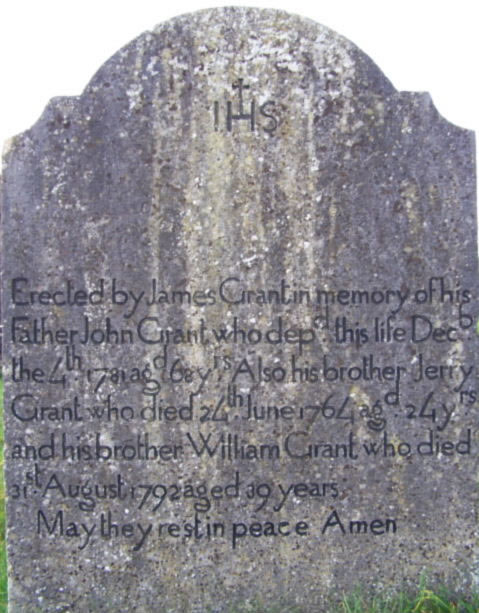 1773 the Register of Deeds shows a transaction in 1773 (ref memorial 200790, book 303, p212), James Grant, a farmer of Moynetemple, rented for ten years at £1 per acre to John, Patrick and Honora Grant (all farmers of Cooleny) some 17 acres of land. A William Grant was witness to this document. Both Moynetemple and Cooleny are in Moyne Parish. I feel that the Loughmore Grants fit somewhere into this Moyne tree, but am not certain exactly where.