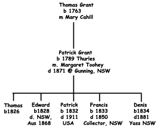 I came across an Australian web tree for Grants from "Thurles, Tipperary" who had migrated to Australia. The format of the trees leads me to think that the information comes from LDS information. It is difficult to be certain if "Thurles" is the parish of Thurles, or that Thurles was the nearest big town. Without more information, one cannot say if this is a branch settled in Thurles, or part of Moyne or Moyalffe trees. I have pulled together the list of Tipperary Grants who emigrated to Australia. And they appear to be mainly come from the Moyaliffe group.