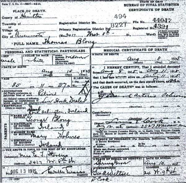 Thomas and Sarah are buried in Spring Grove Cemetery. A few of their children are buried there plus a Joseph Blong b circa 1817 in Ireland , died 1856 (his death was suicide)