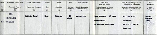 He died on the 9th June 1886, the day Mr Gladstone’s last Home Rule Bill for Ireland was defeated in the Imperial House of Commons. The progress of the Bill was watched with anxiety by Irish Unionists, particularly the Protestant class. The vote took place after two months of debating and, on 8 June 1886, 341 voted against it (including 93 Liberals) while 311 voted for it. Parliament was dissolved on 26 June and the UK general election, 1886 was called. Charles Grant said that during his grandfather’s last illness he continually spoke of the Bill, and his last words to Thomas Grant before he died were “Thank God” when he was told that the Bill had been rejected.