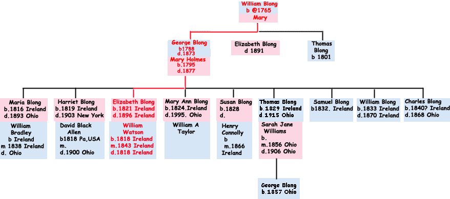 William Blong, was born in Portarlington and baptised in 1833 is noted in the St Pauls register as the third son of George Blong. I believe he died 1860 aged 37 (recorded in state record as William Blane). The implied birth is 1833, and also the Lee Bible has the death of a William Blong on 18 Dec 1870. I have the impression that he was unmarried.