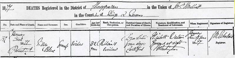 Mary died 3 Jan 1877 age 82. She was a "publican's widow", and the death was reported by Elizabeth Watson (who was her daughter). She died at Kilmalogue, about 1 mile from the town in a NW direction.