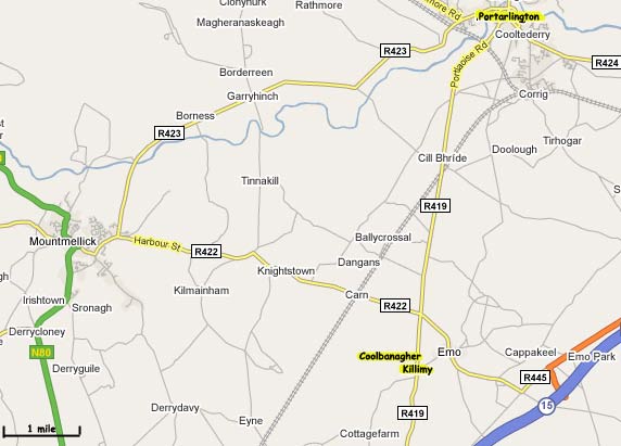 The principal seats are Emo Park the residence of the Earl of Portarlington; Woodbrook of Major Chetwood; Lauragh of the Rev. Sir Erasmus Dixon Burowes Bart, Knightstown of Joseph Kemmis Esq., and Shane Castle of Thomas Kemis Esq., From a desire to introduce manufactures and trade into this part of the country, for the employment of the population Mr. Kemmis has established on his estate at Shane an iron manufactory. The Dublin Grand canal passes through the parish to Mount Mellick, also a tributary stream which running northward fals into the barrow atr portnehinch bridge. Petty sessions are held at Lauragh.