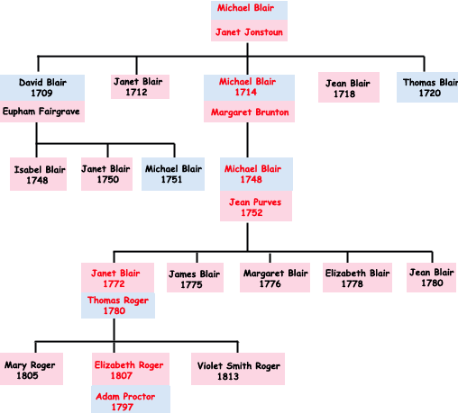 We first pick up the Blair family at Borthwick, south east of Edinburgh, when a Michael Blair marries Janet Jonstoun in 1702.