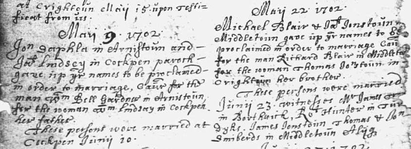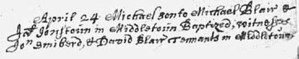 The first of our Blairs is Michael Blair, who married Jane Jonstoun of Middletown, Borthwick on 22 May 1702.