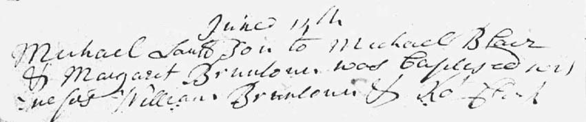Their son, another Michael Blair, was born at Borthwick in 1714, and married Margaret Burntoun in Borthwick in 1742. They only have one child recorded in the records, who was yet another Michael Blair, born in 1748 at Borthwick