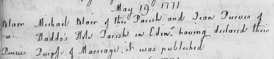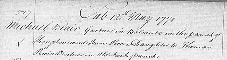 1771 We know we are looking for a marriage of Michael Blair to a Jean Purves from the birth details of their daughter Janet from whom I descend. The only marriage possible on ScotlandsPeople is on 19/05/1771, with banns read at at Kinghorn, Fife. Michael Blair is described as of the Parish of Kinghorn. It does not give her father. Michael has moved from Borthwick to Kinghorn, presumably to get work.
