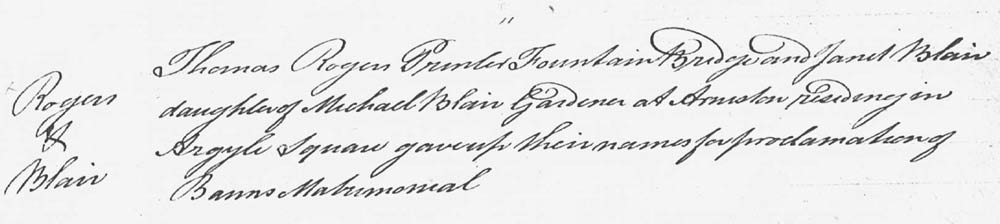 Janet Blair was born in 1772 in Colinton, then a village just outside Edinburgh, the daughter of Michael Blair (a gardener by trade) and Jean Purves. When she marries Thomas Roger (a printer by trade) in 1802, she is living at 5 Argyle Square, Edinburgh, and her parents are at Arniston. She and her husband live most of their life at Fountainbridge, Edinburgh, where their three children are born. Her husband dies in 1830, and she dies in 1836 in Edinburgh.