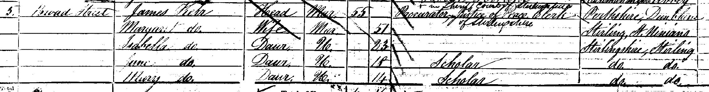 James Kerr, 55 born Dunblane, Perthshire. Procurator, Justice of the Peace, Clerk of Stirlingshire, in Sherrif Court of Stirlingshire.