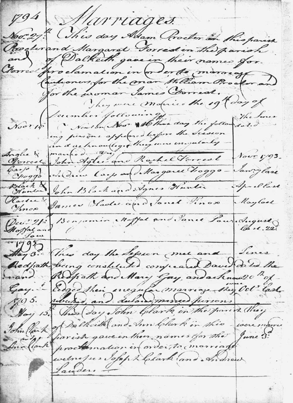 19/12/1794 Adam PROCTER ADAM marries Margaret FORRESTat Newton