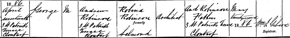 1886 Apr 17. Born Dublin son of Andrew Robinson, an Architect and Robina (nee Salmond)