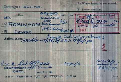 T. /Lt. George Robinson, R. Irish Fus. For conspicuous 'gallantry in action. He led the company of which he was in command with much determination and skill during an attack. He was wounded, but remained with his men until he had seen the whole company dug in on the objective, and then left the line to have his wound dressed only when ordered to do so. He set a fine example of courage and endurance.