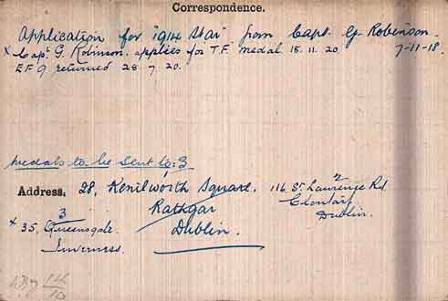 His army record is in Kew Archives ref WO 372/17/47562. He was a Capt in Royal Irish Fusiliers. 3 times wounded and got MC