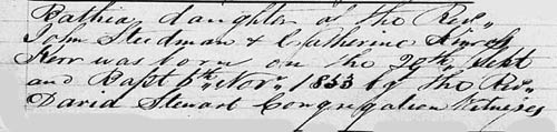 1851 Bathia, daughter of the Rev John Steedman and Katherine Kinross Kerr was born at Stirling on the 29 September 1853 and baptised on 8 November 1853 by the Rev David Stewart.1853