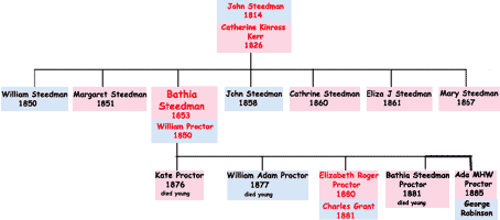 1881 census shows Bathia is missing from her parents household in Stirling, even though her husband and daughter Kate are there. John Steedman, age 67, (born Milnathort, Kinross) and Catherine Steedman 55, his wife living at 12 Abercromby Pl, Stirling. is occupation is given as Minister Of Erskine U P Church. Also in the house on that date were:- William Proctor 31 son in law, Margaret G Steedman 29 (daughter), Mary Steedman 14 (daughter), Katie E S Proctor 5 (grand-daughter), Agnes Finlayson 16 (servant)