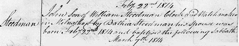 1814 John Steedman was born 22 Feb 1814, (birth entry) son of William Steedman, clock and watch maker, in Orwell, Milnathort, and Bathia Steedman his wife, and baptised the following Sabbath. Presbyterian records show John was educated at the subscription school and later at the University of Edinburgh.