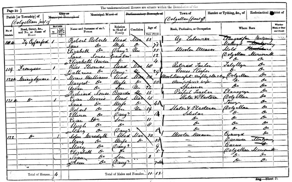 Rees Thomas, age: 68, born: Talyllyn, Merionethshire, Wales, a retired tailor, living only with daughter Cathrine Thomas 29, housekeeper. Their address is Froneeu, in the township of Dolgellau.