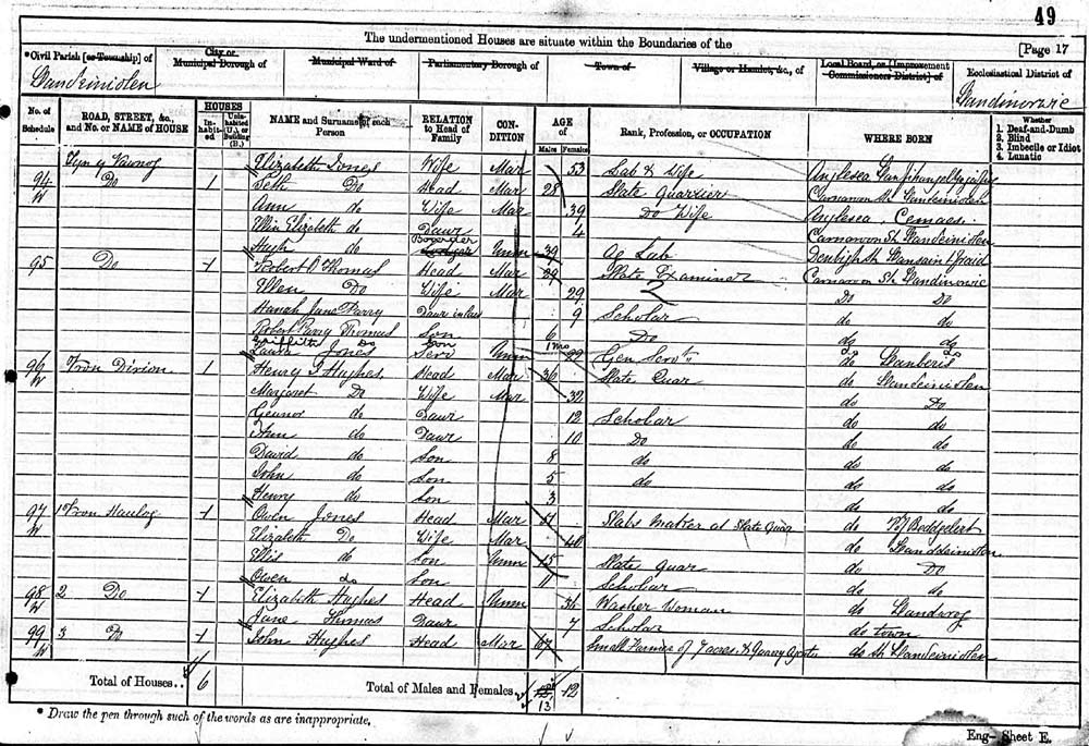 Jane Thomas Age: 7, born Llanddeiniolen. Daughter of Elizabeth Hughes 36 washer woman, born: Llandwrog, Caernarvonshire Living at Fron Haulog, Llanddeiniolen
