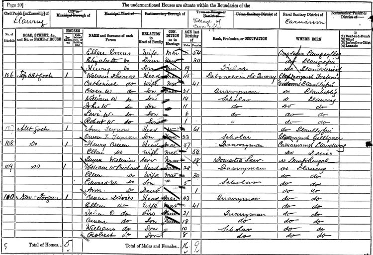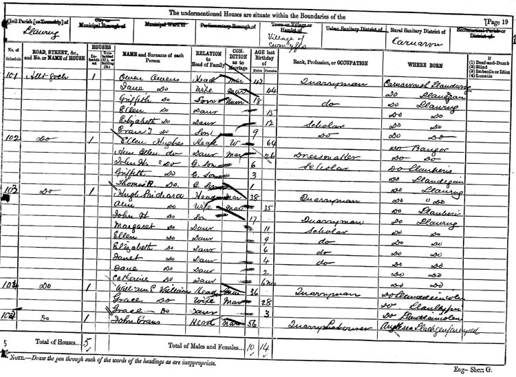 John Evans 56, quarry labourer, born Llachgaufarnydd (??), Anglesea