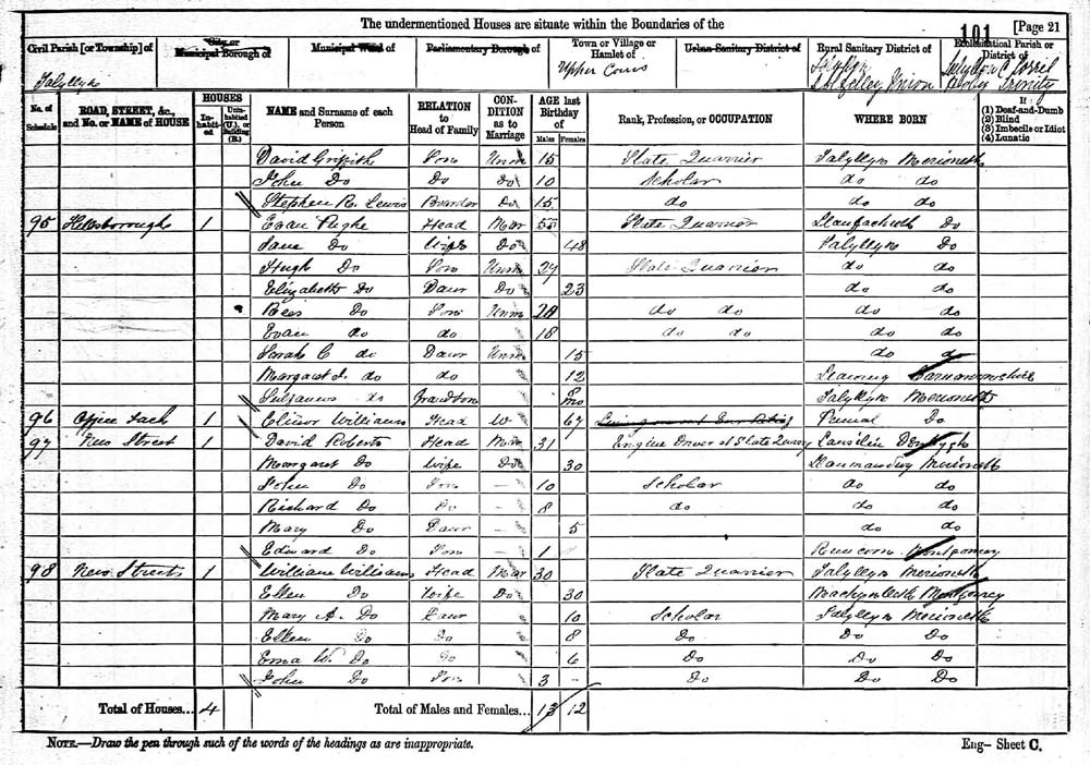 They are listed as living at Hillsborough, Upper Corris, Tal y Llyn. All are given as born there except Evan Pughe himself (the head of household) who was born in Llanfachreth and Margaret born in Llanrug, Caernarvonshire.