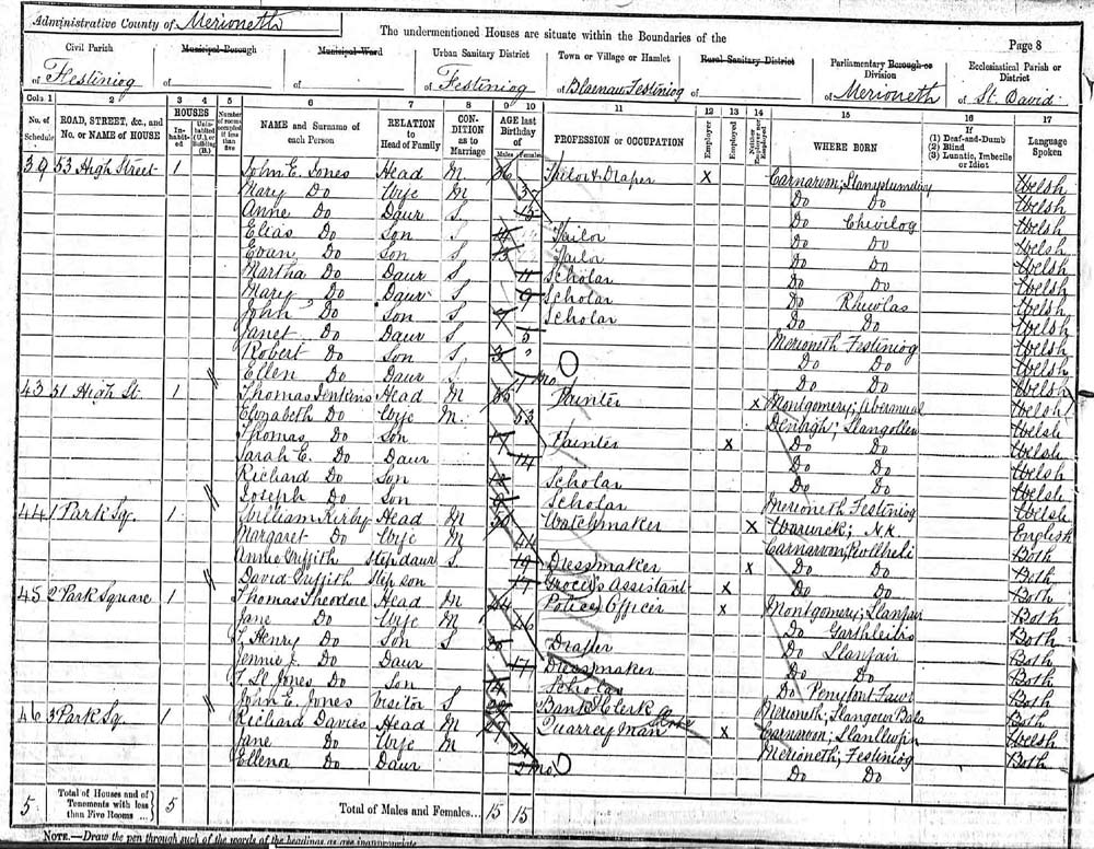 Thomas Jenkins, age 55, born: Abermual, Montgomeryshire. Living with his family at 51 High Street, Ffestiniog. The whole family are monoglot Welsh speakers