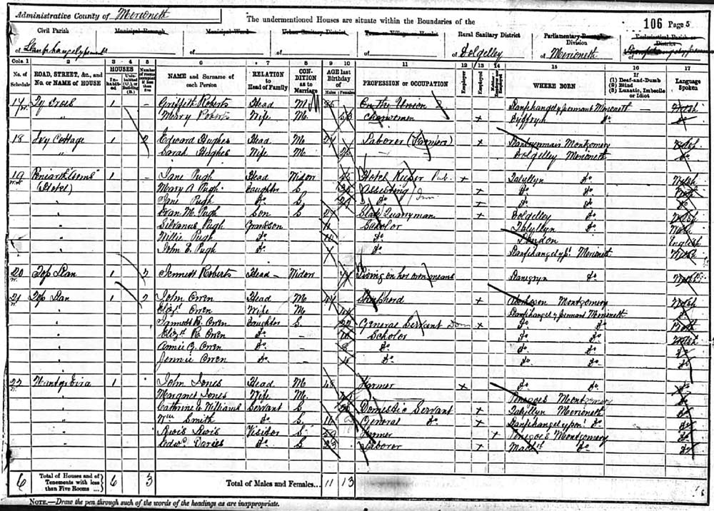 Jane Pugh, age 55, born Talyllyn, Merionethshire, Head of household. A widow