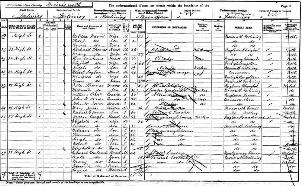 Thos Jenkins, age 67 born: Aberannle, Montgomeryshire, Wales. Living at 52