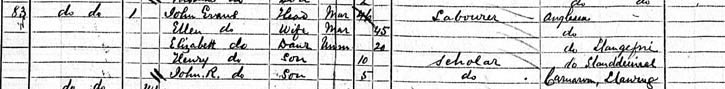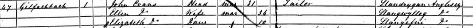 1861 census. Henry Evans was not born when the 1861 census was carried out. The three people living in the household at the time of the census are John Evans (age 31, tailor, born Llandrygan, Anglesey, his wife Ellen (age 36, born Llanwyllog, Anglesey) and her daughter Elizabeth Evans (age 10, born Llangefni, Anglesey). They are living at Gilfachbach, Llanddaniel, Anglesey (the building was uninhabited by the 1881 census). The girl, Elizabeth was his step sister (fathered by a Mr Jones), who came with her mother's marriage to John Evans.