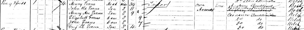 Living with him in the house are his 5 children all born in Llanddeiniolen, John Rd Evans age 11, Henry Herbert Evans age 9, Elizabeth Evans age 9, Jane Evans age 7, Grif Ll Evans age 4