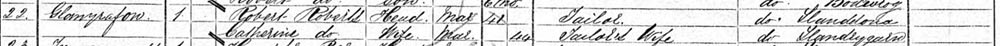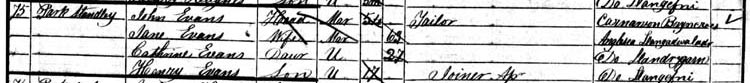1851 census: John, age 54, given as born at Bryncroes, Caernarvonshire. Living at : Llangefni, Anglesey. Occupation: tailor. With family: Jane Evans 63 (born Llangadwaladr, Anglesey), Catherine Evans 27 (born Llandrygan) , Henry Evans 17 (born Llangefni, joiners apprentice). The two older boy's, Owen and John have left home.