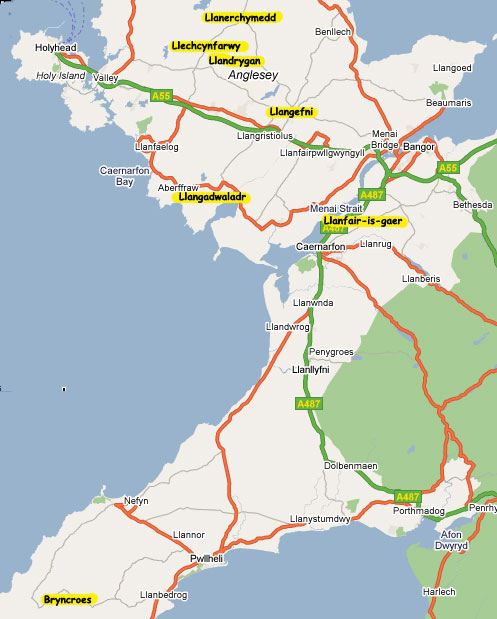 1825 a son John Evans born near Llangefni on Anglesey (before official records began). The place of his birth is difficult to be absolutely certain, as he renders it in a number of different ways in the censuses. The 1861 census gives Llandrygan (this is a clear and unambiguous script) (5miles NW of Llangefni). The 1881 census gives Llachganfarnydd (?), Anglesey, I cannot find this, however there is a Llechcynfarwy on the map, and Llandrygan (listed as his birthplace in 1861) is within a mile of it. My conclusion is that is where he was born in 1825