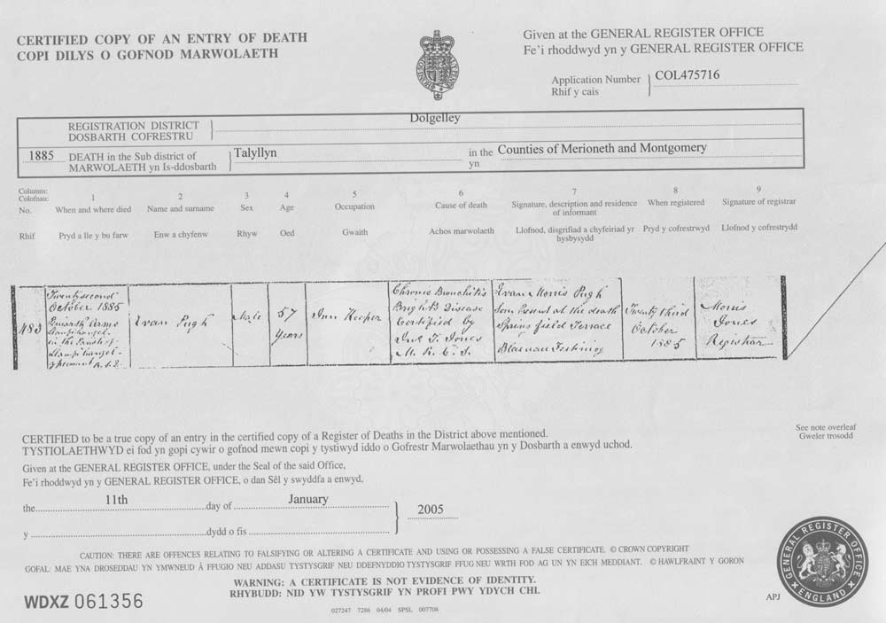 Evan Pugh born 1826 died 1885 - Death Certificate